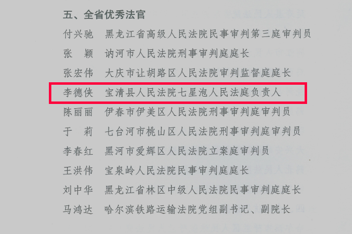 近日,黑龙江省高级人民法院公布《关于表彰全省法院先进集体、先进个人暨全省优秀法院、优秀法庭和优秀法官的决定》,宝清县人民法院七星泡人民法庭负责人李德侠获得全省优秀法官荣誉称号。