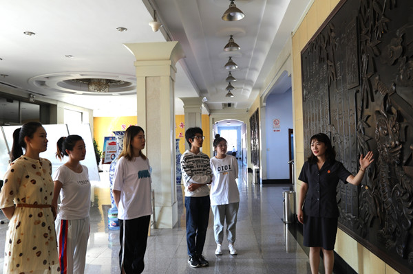 在院浮雕墙前,来自中央财经大学的法学学生鲍裕秋同学脱口而出:“这是法制史书上说的獬豸,我认识!”讲解员趁热打铁,向大家详细介绍了古代传说中“獬豸”的含义,通过竹简、刑鼎及法徽、法槌等元素,让学生们重温了中华法制史及新中国法制建设的发展历程。